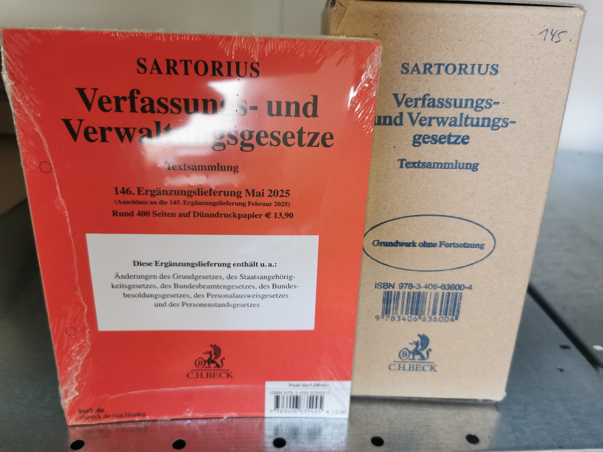 Angeboten wird ein Exemplar der Ergänzungslieferung des Sartorius in der 146. EL (Gesetzesstand: Mai 2025; Einzel-Preis 13,90 €) zum Nachsortieren. Die Grundwerke sind in gutem, gebrauchten Zustand ohne Markierungen und Randbemerkungen.